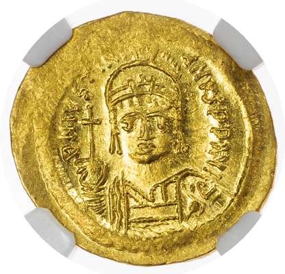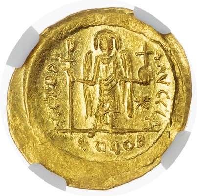 DN IVSTINI-ANVS P P AVI, helmeted bust of Justinian facing, holding globus cruciger and shield decorated with horseman motif. Rev. VICTORI-A AVGGG A, angel standing facing, holding long, Christogram-topped cross and globus cruciger, star in right field, CONOB in exergue. (Sear 140).