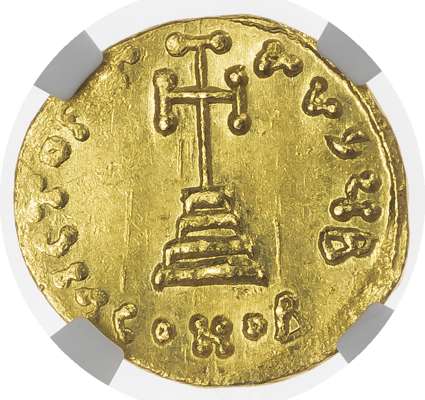 D IЧSTINIANЧS PЄ AV, crowned and draped bust of Justinian II facing, holding globus cruciger. Rev. VICTORIA AVζЧB, cross potent on three steps, CONOB in exergue. (Sear 1246; MIB 6).