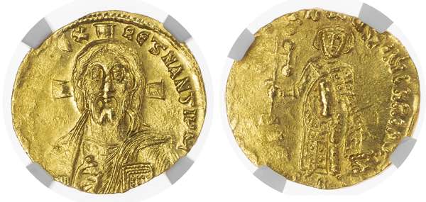 IhS CRIStDS RЄX-RЄϚNANtIЧM, bust of Christ facing, with long hair and full beard, holding book of Gospels and raising his right hand in benediction, cross behind. Rev. D IЧStINI-AN-ЧS SERЧ CHRIStIZ, crowned figure of Justinian II facing, holding cross potent on three steps, CONOB in exergue. (Sear 1248; MIB 8).