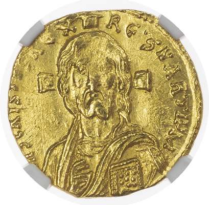 IhS CRIStDS RЄX-RЄϚNANtIЧM, bust of Christ facing, with long hair and full beard, holding book of Gospels and raising his right hand in benediction, cross behind. Rev. D IЧStINI-AN-ЧS SERЧ CHRIStI, crowned figure of Justinian II facing, holding cross potent on three steps, CONOB in exergue. (Sear 1248; MIB 8).
