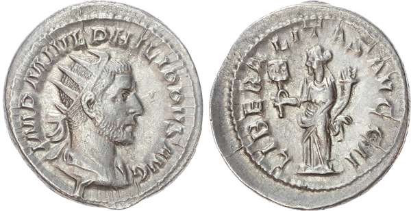 Radiate, draped and cuirassed bust right. Rev. Liberalitas standing left, holding abacus and cornucopiae. (RIC 38b). Extremely Fine.