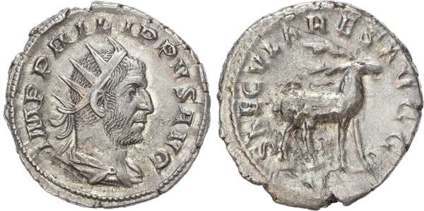 Radiate, draped and cuirassed bust right. Rev. Deer standing right.. (RIC 19). Extremely Fine.