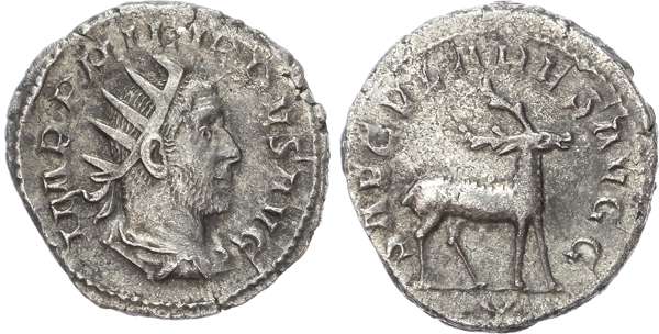 Description Radiate, draped and cuirassed bust right. Rev. Deer standing right. (RIC 19). Good Very Fine. Somewhat heavy flan.