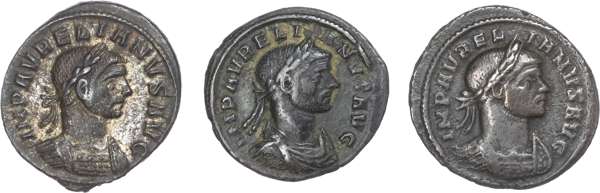 Aurelian (AD 270-275). AE Denarii (3). Rome (offs. A and B). Laureate and cuirassed bust right. Rev. Victory advancing left, bound captive at feet. (RIC 73). Good Very Fine.