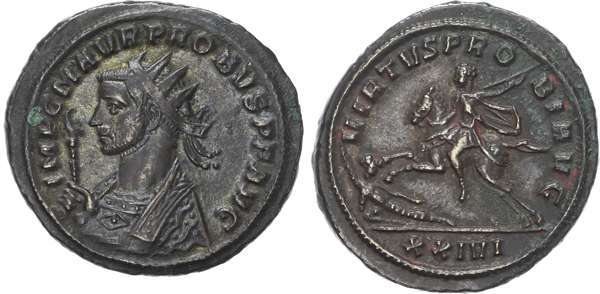 IMP C M AVR PROBVS P F AVG, radiate and mantled bust left, holding eagle-tipped sceptre. Rev. VIRTVS PRO-BI AVG Probus on horseback left, spearing fallen enemy, XXIVI in exergue. (RIC 818). Good Very Fine.