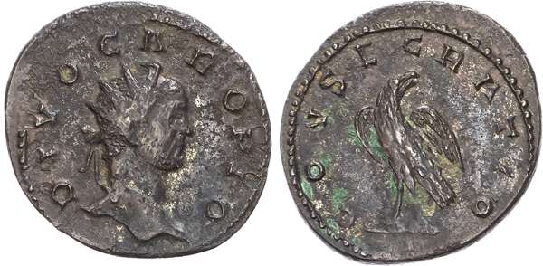 DIVO CARO PIO, radiate head of Divus Carus right. Rev. CONSECRATIO, eagle standing left, head right. (RIC 29). Very Fine.