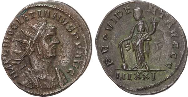 IMP C DIOCLETIANVS P F AVG, radiate, draped and cuirassed bust right. Rev. PROVIDE-NTIA AVGGG, Providentia standing left, holding rudder on globe and cornucopiae, S-F across fields, MLXXI in exergue. (cf RIC 12). Good Very Fine. Very Rare.