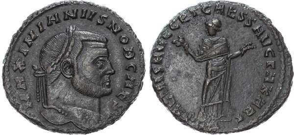 MAXIMIANVS NOB CAES, laureate head right. Rev. SALVIS AVGG ET CAESS AVCTA KART, Carthago standing facing, head left, holding fruits in both hands. (RIC 28b). Good Very Fine.