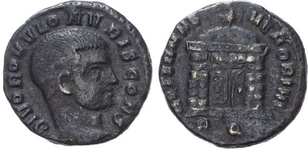 DIVO ROMVLONIBVS CONS, bare head right. Rev. AETERNAE MEMORIAE, domed temple with door ajar, topped with eagle, RQ in exergue. (RIC 239). Good Very Fine. Rare.