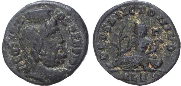 DEO SANCTO SERAPIDI, draped bust of Serapis facing right. Rev: DEO SANCTO NILO / Γ / ALE, The River Nile reclining left, leaning on rocks and holding reed and Cornucopiae. (Alfoldi 35; Vagi 3384). Very Fine. Very Rare.