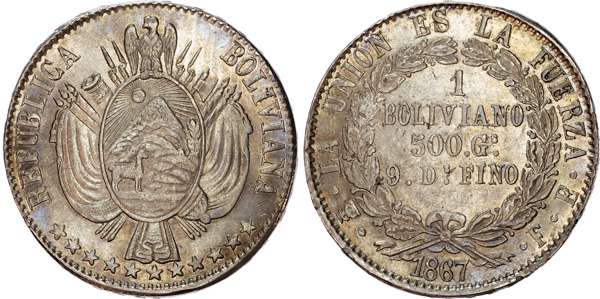 Bolivia, Republic, silver Boliviano (2), including: 1865 PTS FP, 25.30g (KM 152.1) and 1867 PTS FE, 25.04g (KM 152.2). Potosi mint. Good Very Fine. (2)