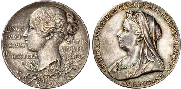 (56mm/83.13gm) by G. W. de Saulles after T. Brock for the Royal Mint. Veiled bust left of Victoria. Rev, young bust of Victoria as she came to the throne 60 years previously, olive branch below (Eimer 1817a; BHM 3506). As Struck, iridescent tone over matt surfaces, in original case of issue (sound).