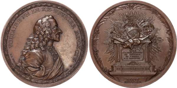 Bust of Voltaire right. Rev, trophies symbolizing the arts, sciences and war, on an altar (Wurzbach 9185; Molinari 347). Nearly As Struck.