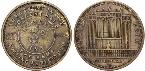 Day’s Crystal Palace (Smallbrook St.) 3d. (32mm.); Rodney Inn Concert Hall (Coleshill St.) 3d. (31.5mm.); Holder’s Concert Hall (Coleshill St.) 3d. (30mm.); Spread Eagle Concert Hall (Bull Ring) 3d. (31mm). All third quarter of the 19th. c. [4] Generally Very Fine.