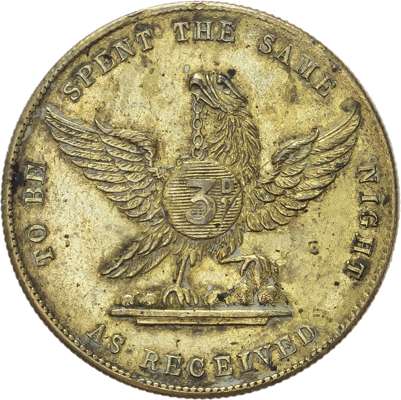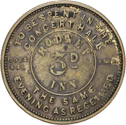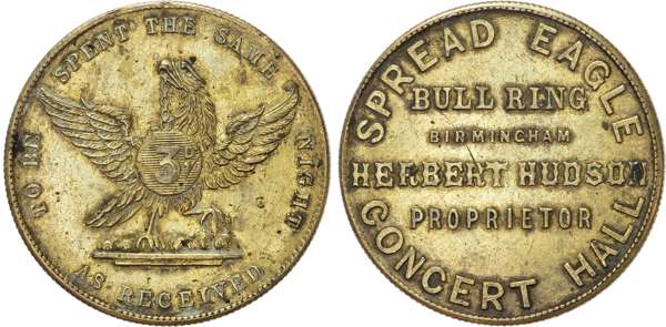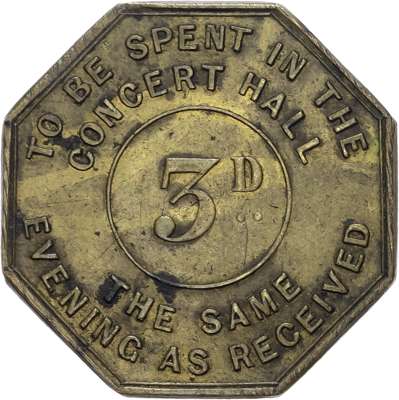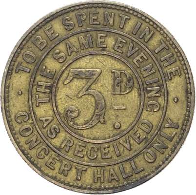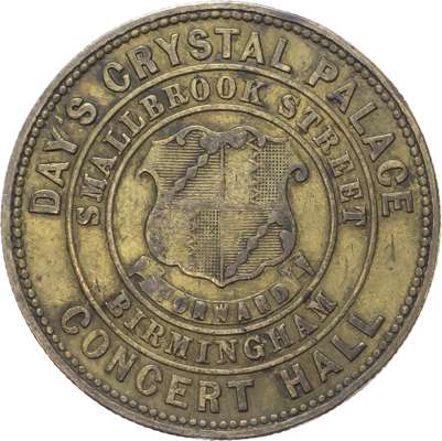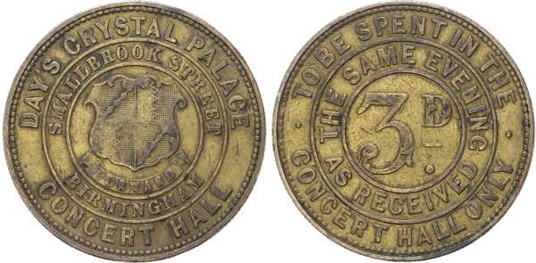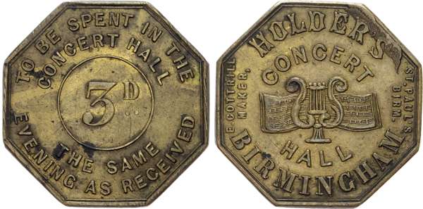 Inshaw’s Mechanical Lecture and Concert Hall (Moreville St.) 3d. (35mm.); Udall’s Royal Exchange Concert Hall, (Walsall St. W. Bromich) 3d. (32m,); Day’s Crystal Palace (Smallbrook St.) 3d. (32mm.); Rodney Inn Concert Hall (Coleshill St.) 3d. (31.5mm.). [4] Generally Very Fine.