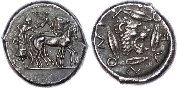 Sicily, Leontini (c. 476-466 BC) AR Tetradrachm, 17.23g. Charioteer, holding kentron and reins, driving quadriga right, Nike above, crowning the horses. Rev. Λ-EONT-I-NON, head of a roaring lion right, four grains of barley around. (SNG ANS 202-3; HGC 2, 660). Extremely Fine. Exceptionally well struck obverse.