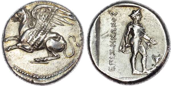 Thrace, Abdera (c. 360-350 BC) AR Tetradrachm, Egisinonos, magistrate, c. 355 BC, 11.35g. Griffin left, [ABΔH] above. Rev. EΠI ZHNΩNOΣ, Hermes, wearing petasos and chlamys, standing right, holding a short staff and extending left hand, kantharos to right, all within an incuse square. (May 448 (A301/ P355)). Good Very Fine. Rare.