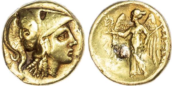 Kingdom of Macedon, Alexander the Great (336-323 BC) AV Stater, uncertain mint, possibly Amphipolis, 7.16g. Helmeted head of Athena facing right. Rev. Nike standing left, holding wreath and stylis. Fine. Mount removed and metal replaced on reverse.