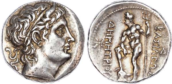 Kingdom of Macedon, Demetrios I Poliorketes (306-283 BC) AR Tetradrachm, mint of Chalkis, 290-287 BC, 17.04g. Diademed and horned head facing right. Rev. BAΣIΛEΩΣ / ΔHMHTPIΟΥ, Poseidon standing left with foot on rock, holding trident, star in left field, Δ in right. (Newell 152; HGC 3.1, 1014f). Nearly Extremely Fine.