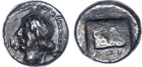 Thessaly, Larissa (c. 479-460 BC) AR Obol, 1.00g. Head of the nymph, Larissa, facing left. Rev. Λ-Α-R, sandal of Jason right. (BCD Thessaly 140). Good Very Fine.