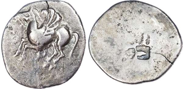 Corinthia, Corinth (c. 550-500 BC) AR Stater, 7.91g. Pegasos flying left, koppa below. Rev. Quadripartite incuse square, graffi to around. (BCD Corinth 3; Rosen 225; Calciati 21). Very Fine. A very rare archaic piece.