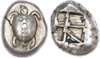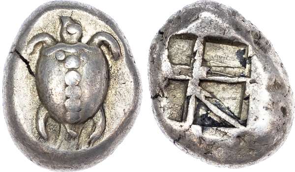 Islands off Attica, Aegina (c. 470/65-445-40 BC) AR Stater, 12.13g. Sea turtle with dotted shell, head left. Rev. Incuse skew pattern. (HGC 6, 435; Milbank 111a). Nearly Extremely Fine. Flan split.