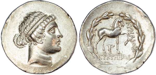 Aeolis, Kyme (c. 165-140 BC) AR Tetradrachm, Stephanophoric type, Euktemon, magistrate, 16.85g. Head of the Amazon Kyme facing right. Rev. ΚΥΜΑΙΩΝ / EYKTHMΩN, horse stepping right, cup below, all within a wreath. (Oakley obverse dies 55/k (this coin); BMC 77). Good Very Fine. Large flan. An impressive coin.
