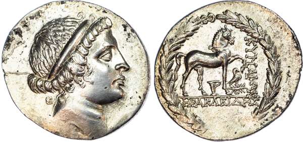 Aeolis, Kyme (c. 165-140 BC) AR Tetradrachm, Stephanophoric type, Heraleides, magistrate, 16.54g. Head of the Amazon Kyme facing right. Rev. ΚΥΜΑΙΩΝ / HPAKΛEIΔHΣ, horse stepping right, cup below, all within a wreath. (Oakley obverse die 64; SNG Copenhagen 105 (this obverse die)). Nearly Extremely Fine. Scratch behind portrait. Rare.