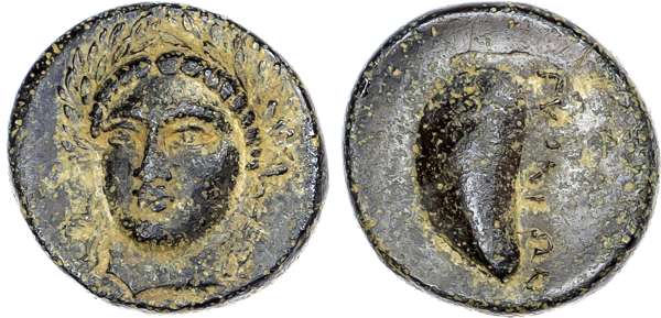 Aeolis, Gryneion (c. 4th Century BC) AE Unit, 4.62g. Laureate head of Apollo facing slightly to the left. Rev. Mussel shell. (SNG Copenhagen 202; SNG von Aulock 7689; SNG Ashmolean 1445-6). Very Fine.