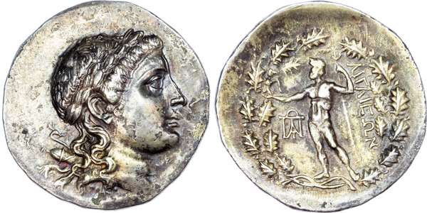 Aeolis, Aigai (c. 151-143 BC) AR Tetradrachm, Stephanophoric type, 16.63g. Wreathed head of Apollo Smintheos facing right, bow and quiver over shoulder. Rev. Zeus standing left, holding eagle and sceptre, AIΓAIEΩN to right, monogram to left, all within an oak wreath. (SNG Ashmolean 1252; SNG von Aulock 1595; SNG Copenhagen 5). Good Very Fine. A few light scratches. Very Rare.