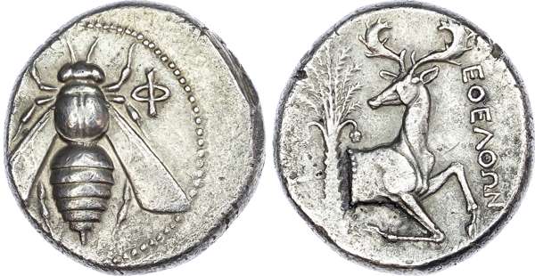 Ionia, Ephesos (c. 390-325 BC) AR Tetradrachm, Eolthon, magistrate, c. 360-350 BC, 14.77g. Bee with straight wings. Rev. EOEΛΘΩN, forepart of stag right, head left, palm tree behind. (Pixodarus obverse die 93; SNG von Aulock 1829). Good Very Fine. Struck off -centre. Pleasing cabinet tone.