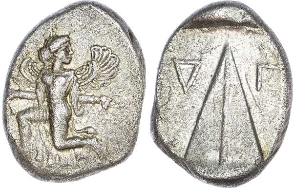 Caria, Kaunos (c. 410-390 BC) AR Stater, 11.34g. Winged female deity in running stance left, head right, holding wreath. Rev. Baetyl with vertical line, Δ and Γ above, all within an incuse square. (Konuk Period V, 114 (O53/R54); SNG von Aulock 2530). Good Very Fine. Somewhat granular surfaces.