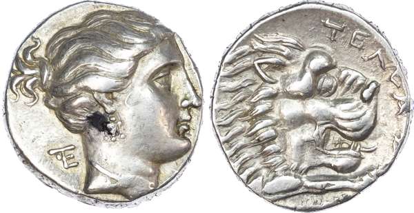 Caria, Knidos (c. 350-330/20 BC) AR Tetradrachm, Teleas, magistrate, 15.20g. Head of Aphrodite facing right, her hair tied back, wearing a triple‑pendant earring and necklace, monogram behind. Rev. TEΛEAΣ - [KN]IΔI[ΩN], forepart of lion right. (Apparently unpublished tetradrachm with this magistrate). Good Very Fine. Uneven spot of toning to obverse.