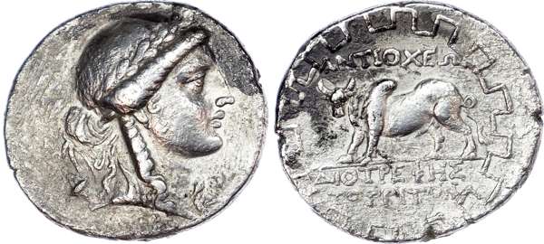 Caria, Antioch ad Meandrum (c. Mid-Late 2nd Century BC) AR Tetradrachm, Diotrephes, magistrate (third time), 15.54g. Laureate head of Apollo facing right, bow and quiver over shoulder. Rev. Zebu (humped bull) standing left, ANTIOXEΩN above, ΔIOTPEΦHΣ/TO TPITON below, all within a meander pattern border. (Lanz 125; Gorny & Mosch 151, lot 190; Otherwise unpublished). Very Fine. Some deposits. Extremely Rare, only the second known of this magistrate in office for the third time.