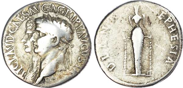 Claudius, with Agrippina Junior (AD 41-54) AR Cistophoric Tetradrachm, Ephesus, AD 51, 10.65g. Jugate heads of Claudius and Agrippina left. Rev. Cult statue of Artemis Ephesia standing facing. (RIC 119; RPC 2224). Very Fine.