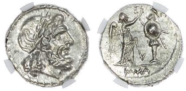 Roman Republic, Anonymous (c. 211-208 BC) AR Victoriatus, uncertain mint, 3.17g. Laureate head of Jupiter facing right. Rev. Victory standing right, crowning trophy of arms. (Crawford 95/1a). Graded and encapsulated by NGC as MS (4374449-040)