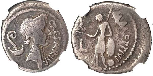 Julius Caesar (44 BC) AR Denarius, mint of Rome, M. Mettius, moneyer, 3.91g. CAESAR IMP, laureate head of Caesar right, implements behind. Rev. Venus standing right, holding spear, shield and Victory. (Crawford 480/3; Sydenham 1056). NGC encapsuled VG, #6134692-001.