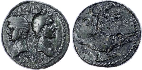 Augustus (27 BC – AD 14) AE As, mint of Colonia Nemausus, c. 10 BC – AD 10, 12.18g. IMP / DIVI F, back-to-back heads of Augustus (wreathed) and Agrippa (wearing a rostral crown). Rev. COL‑ NEM, crocodile right, chained to palm tree. (RIC 158; RPC I, 524). Obverse Good Very Fine for issue, reverse Fine. The usual flan reduction marks. Pleasing green patina.