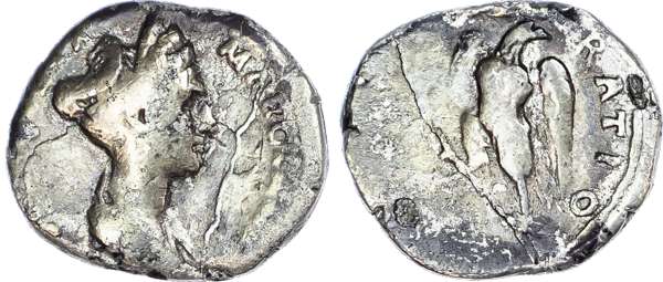 Diva Matidia (niece of Trajan) (Died AD 119) AR Denarius, Consecration issue, Rome, 2.46g. Draped bust of Matidia facing right, hair in triple‑stephane. Rev. Eagle standing left, head right. (RIC 2462; RSC