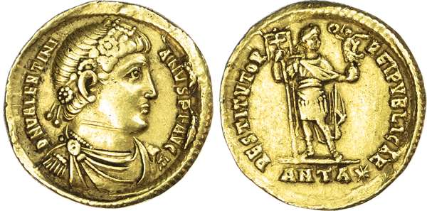 Valentinian I (AD 364-375) AV Solidus, Antioch, AD 365, 4.41g. Diademed, draped and cuirassed bust of Valentinian right. Rev. Emperor standing left, head right, holding labarum and Victory on globe, ANTA in exergue. (RIC 2a). Very Fine.