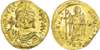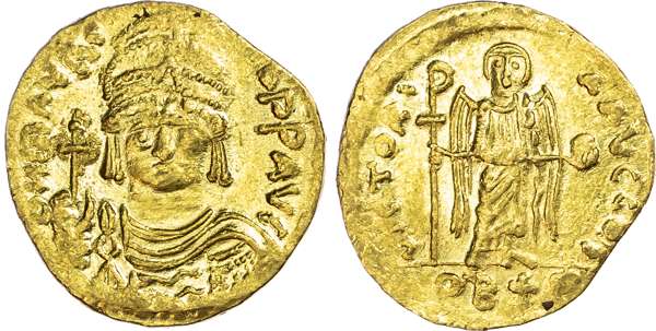Maurice Tiberius (AD 582-602) AV Solidus, Constantinople, 4.08g. Crowned and cuirassed bust facing, holding globus cruciger. Rev. Angel standing facing, golding pendilia and globus cruciger. (Sear 482). Good Very Fine.