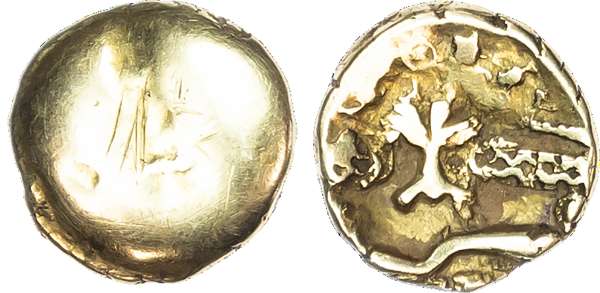 Celtic Imported Coinages, Morini (c. 60-30/25 BC) AV ¼ Stater, ‘Uniface Plain Tree’ type (Gallo-Belgic DB), 1.37g. ‘Boat’ motif with three figures. Rev. ‘Tree’ motif, bar below. (ABC 43; Van Arsdell 69-1). Good Very Fine for issue.