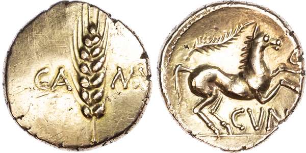 Trinovantes & Catuvellauni, Cunobelin (c. AD 8-41) AV Stater, ‘Wild Series A’ type, 5.38g. CA – MV, ear of barley. Rev. CVN[O], horse rearing right, branch above. (ABC 2777; VA 1931-1; BMC 1784-803). Good Very Fine. Rare.