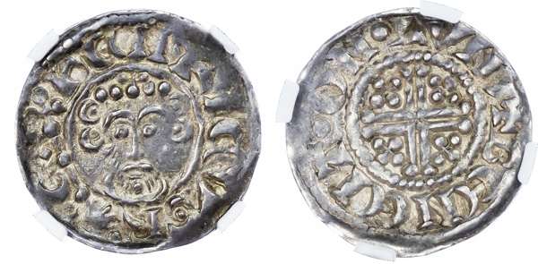 John (1199-1216), AR Penny, Class 5B, Beneit on London, 1.45g. Crowned facing bust holding sceptre. Rev. Short cross, quatrefoils in angles. (S. 1351). Encapsulated by NGC as AU55 (#6675098-003).