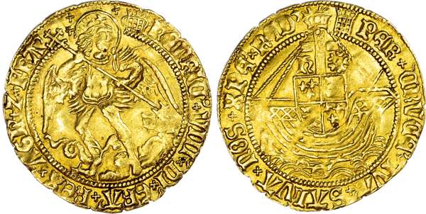 Henry VIII (1509 - 1547), Angel of six shillings and eight pence, first coinage (1509 - 1526), St Michael slaying dragon, inner beaded circles both sides, mintmark crowned portcullis with chains (c.1513-26), legend surrounds HENRIC VIII9 DI GRA REX AGL Z FR. Rev, ship sailing right, quartered fl at topped shield of arms at centre, h and rose either side of cross above, ships rigging: two bowstrings to the left one to the right, legend reads PER CRVCE TVA SALVA NOS XPE REDE, 4.93g (S.2265; N.1760; Schneider 561). Good very fine, portrait bold. Edge slightly irregular and a little short of flan.