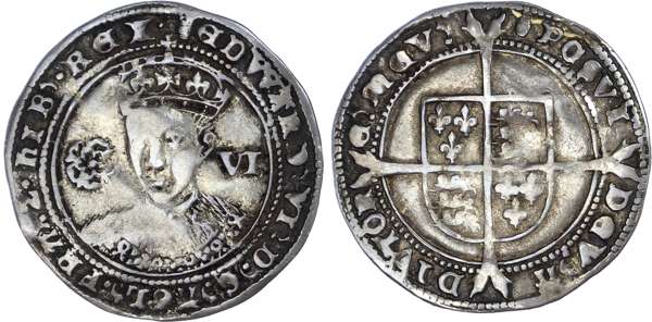 Edward VI (1547-1553), Sixpence, third period, fi ne silver, m.m. tun both sides, wire inner circle within beaded circle, legend reads EDWARD VI DG AGL FRA Z HIB REX, crowned bust facing, rose to left, mark of value to right. Rev, legend commences POSVI DEV A DIVTOR E MEV. Rev, square topped quartered shield of arms over long cross fourchée, 2.61g (S.2483; N.1938). Some flatness with a strong portrait, about very fine, for issue with eye appeal.