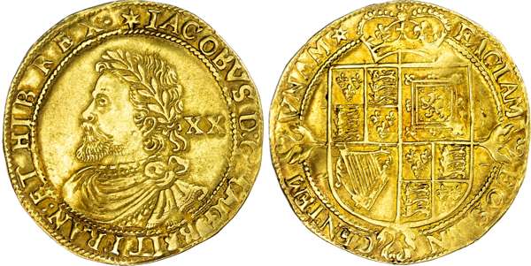 James I (1603-1625), Laurel, third coinage (1619-1625) mintmark: Spur Rowel 1620-1621, Second medium square headed, laureate bust left, XX behind, IACOBUS DG MAG BRIT FRAN HIB REX, rev. Crowned Royal Arms over cross fl eury, FACIAM EOS IN CENTEM VNVM, I will make them one nation, 8.94gm. (S 2638; Schneider 83; North 2114). Well struck, all parts of legends visible, good very fine or better.