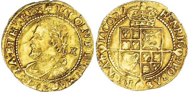 James I (1603-1625), Half-Laurel, third coinage (1619-1625), mintmark Trefoil (1624), legend surrounds IACOBVS DG MA BRI FRA ET HI REX, fourth laureate draped and cuirassed bust left, value X behind for value of ten shillings. Reverse crowned quartered coat of arms over long cross fleury, reads HENRIC VS ROSAS REGNA IACOB, (S.2641A; N.2117). Well struck, good very fine some parts better.