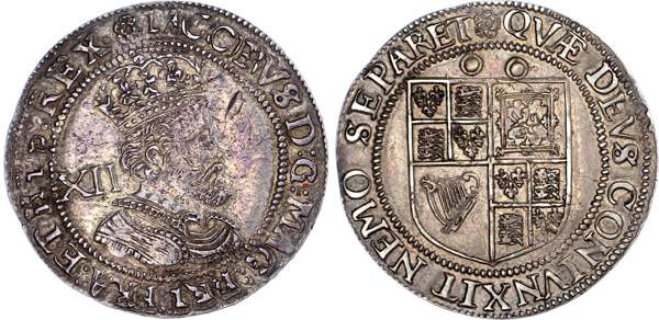 with longer curly hair, denomination XII, behind, legend surrounds JACOBVS DG MAG BRI FRA ET HIB REX, within beaded linear circle. Rev, square topped quartered shield of arms, reads QVAE DEVS CONIVNXIT NEMO SEPARET, 5.97g (S.2668; N.2124). Struck on full flan, legends clear for the most part despite some doubling, strong portrait with some annealing fissures mainly on obverse. In its feel and general aesthetic the above coin does resemble a ‘fine works’, especially so on the reverse. Test mark punches above shield, good very fine.
