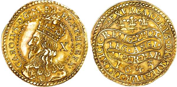 Charles I (1625-1649), Civil War Issues, Oxford, 'Declaration' Half-Unite, 1643, larger crowned and draped bust left extending to the bottom of the coin, value behind, inner and outer beaded borders, legend reads from bottom left CAROLVS DG M BR FR ET HI REX. Rev, outer legend surrounds EXVRGAT DEVS DISSIPENTVR INIMICI. Inner legend declaration made at Wellington, Shropshire,